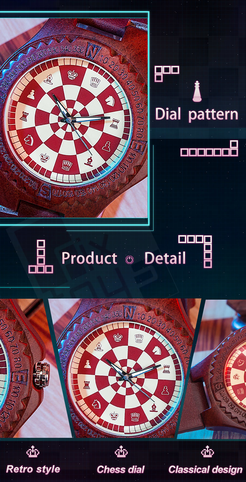 นาฬิกาข้อมือจากอนิเมะ No Game No Life ตัวเรือนนาฬิกาทำจากไม้เนื้อแข็ง สามารถใส่กันน้ำได้ ด้านในหน้าปัดเป็นรูปตารางหมากรุก บอกเวลาแบบเข็ม สายมี 2 แบบให้เลือกแบบสายหนังและสายไม้